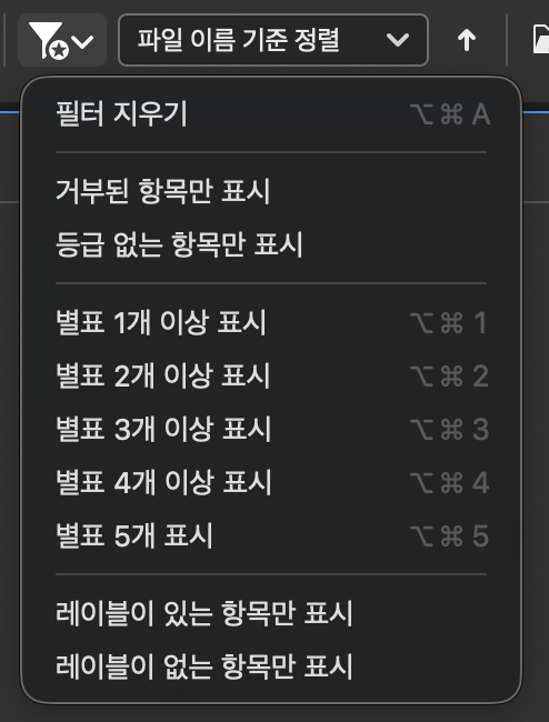 5. 콘텐츠 창 위에 깔때기 모양 아이콘을 누른 후 '별표 1개 이상 표시'를 클릭하시면 셀렉 하신 사진들로만 정렬이 됩니다. 다시 모든 사진을 보시려면 '필터 지우기'를 누르시면 됩니다. 이후 최종 셀렉을 위해 별점 1개 있는 사진들에 Ctrl+2 or Command +2로 한 번 더 필터링을 거쳐서 셀렉 해주시면 됩니다.